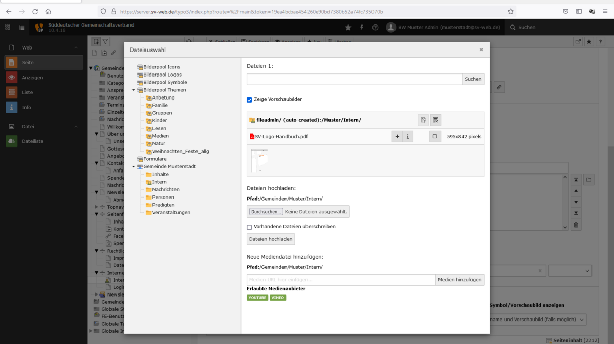 Wenn Dateien für den internen Gebrauch im Internen Bereich zur Verfügung gestellt werden sollen, müssen Sie zuvor mit dem Werkzeug Dateiliste in der Ordner Intern hochgeladen werden. Nur darin sind diese Dateien vom Zugriff von außen und auch dem Auffinden von Suchmaschinen gesvhützt.